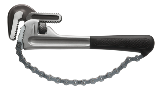 Heavy-gauge pipe wrench with a chain strap for gripping large diameter pipes in oil fields.
