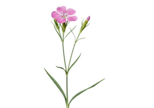 A delicate pinkish-purple dianthus flower with green stem, leaves, and unopened bud, against a transparent background with copy space, soft lighting, no shadows. Concept of botanical elegance and