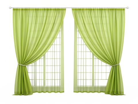 Sheer lime green curtains draped across two tall windows, isolated on a transparent background
