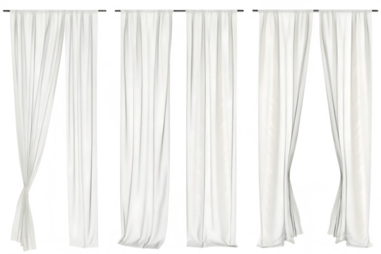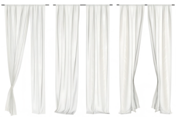 White sheer curtains with different drapery, semi-transparent alpha channel isolated on white background PNG