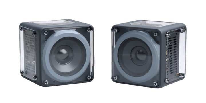 Two pink portable radios, symmetrically positioned, with silver speaker cones, isolated against a black background