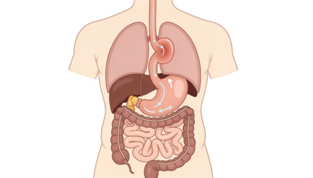 Simplified patient handout style illustration of the diaphragm and stomach highlighting a hiatal hernia causing acid reflux with clear anatomical labels isolated on white.