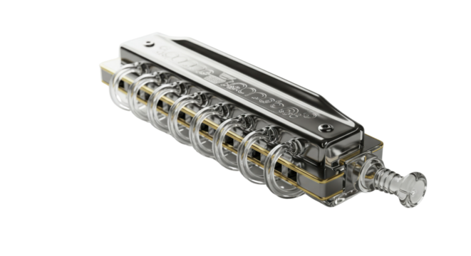 Shiny silver and gold metal diatonic harmonica music instrument isolated on a transparent background