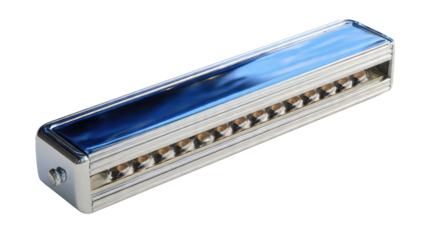 A close up view of a shiny silver harmonica musical instrument isolated on transparent background