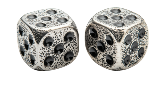 A Pair of Silver Dice with Engraved Dots Perfect for Casino Nights, Board Games, and Decoration.