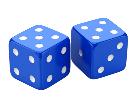 A - Pair of Blue Dice with White Dots, Angled Front View, Isolated on Transparent Background.