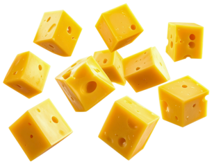 Cheese cubes floating, savory dairy appetizer ingredient, yellow food pieces for cooking or snacking, transparent background