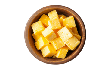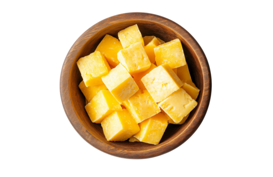 Heap of diced tofu cheese in wooden bowl isolated on transparent background