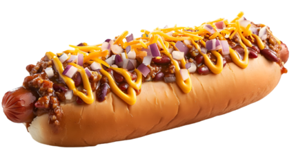 A chili dog topped with rich chili, shredded cheese, and diced onions,, transparent background