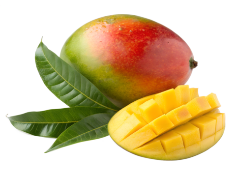 Delicious fresh ripe whole mango fruit with vibrant green leaves and a juicy diced half, isolated on transparent png background.