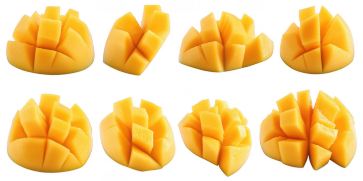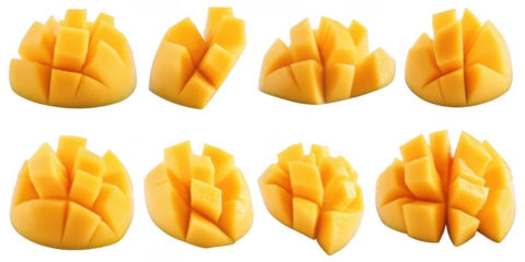 Diced mango cubes on transparent background fresh fruit display studio shot bright colors