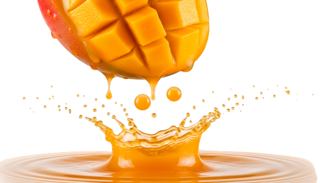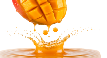Diced Mango Splashing Juice isolated on transparent background - Tropical Freshness