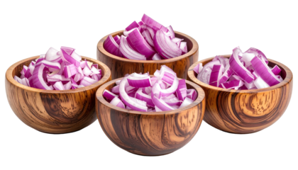 Three wooden bowls filled with sliced and diced red onions
