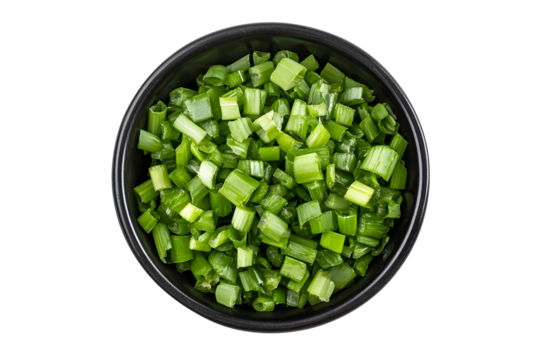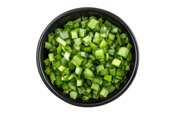 Chopped green onion in a black ceramic bowl isolated on transparent or white background, png