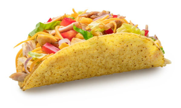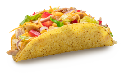 Mexican chicken meat taco, corn-based tortilla with chicken meat and diced fresh vegetables filling isolated. Top view.