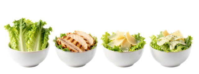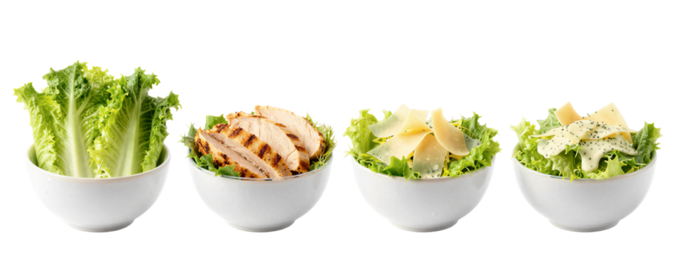 Four white bowls of salad, each with different toppings: leafy greens, grilled chicken, sliced apples, and diced cheese with pepper.