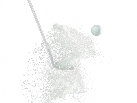 Golf Ball golfer hit snow to explode and splatter. Sand wedge golf dick ball from snow field and snow fly in air. Night black background isolated