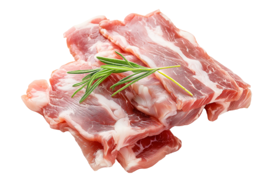Selection of raw pork meat cuts for grilling and cooking barbecue ribs bacon sausage chop loin roast on transparent background