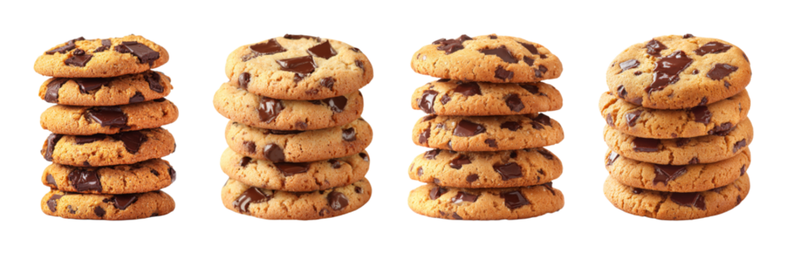Delicious chocolate chip cookies stacked high, warm lighting, studio shot, perfect for food blogs and bakery ads PNG set with transparent background