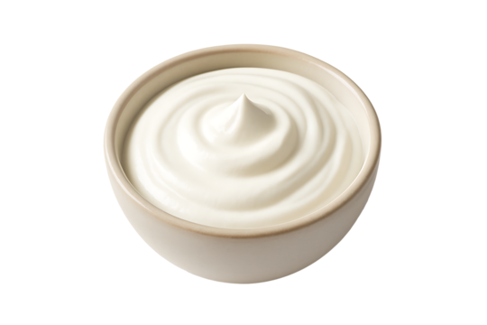 Creamy white yogurt swirl served in ceramic bowl isolated on white background presenting fresh dairy texture healthy nutrition breakfast ingredient and natural organic food concept