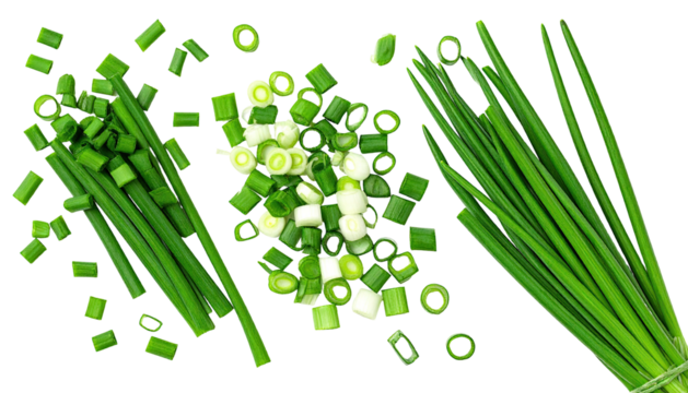 Close-up top view of freshly cut green chives, some whole, others chopped, on black