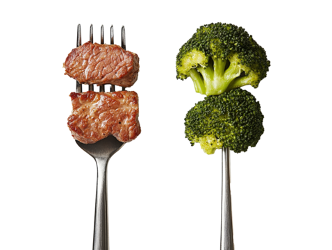 Forks with grilled meat and broccoli on a white background, representing a balanced diet.