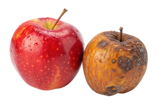 A fresh red apple with water droplets next to a spoiled rotten apple isolated on transparent background