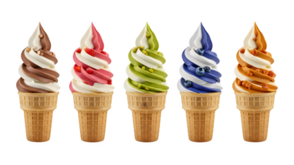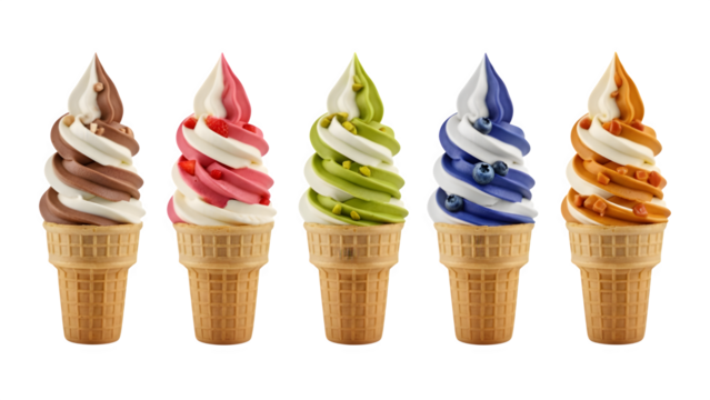 Ice cream scoop on waffle cone on transparent background cutout, PNG file. Many assorted different flavour Mockup template for artwork design., Set of Ice cream cones with different flavors, isolated