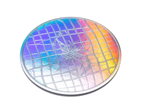 A close-up of a round holographic diffraction grating with a spiderweb-like fracture pattern on a black background.