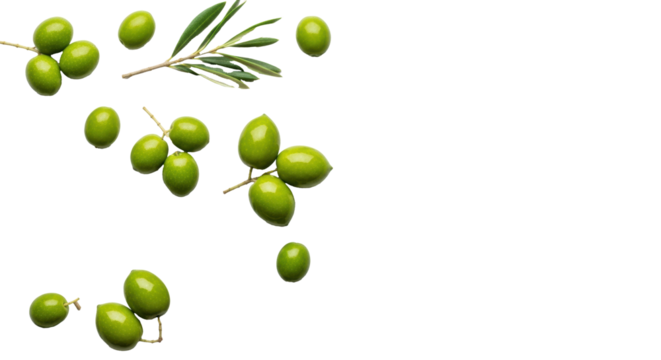 Fresh green olives of varying sizes and vibrant olive branches on a clean matte white background, illuminated by soft diffuse natural daylight, flat lay, top-down, concept of mediterranean wellness