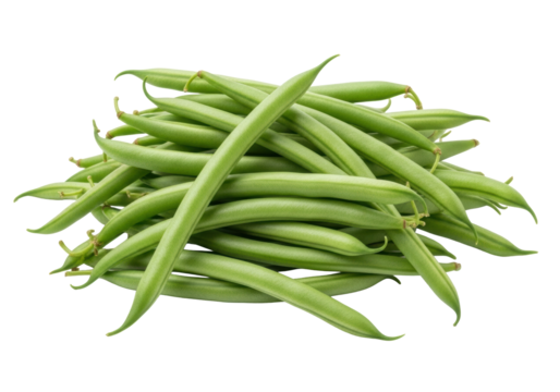 A generous pile of crisp, vibrant green beans with subtle natural texture, artfully arranged on a pristine transparent studio background with bright, diffuse lighting, shot from a high angle.