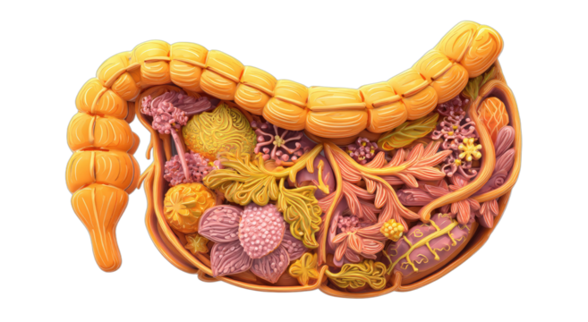 Human small and large intestine showing anatomical structure, digestive system, colon, and gut health on transparent background