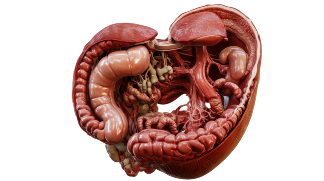 3D anatomical model of the human stomach, illustrating digestive organ structure. Ideal for educational and medical purposes in understanding human anatomy. Isolated on transparent background
