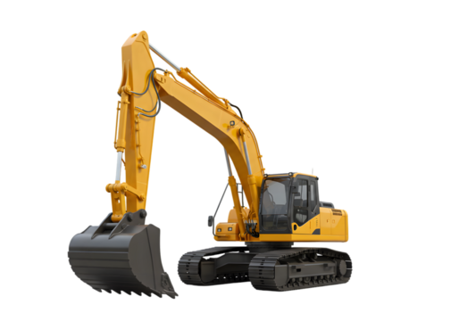Heavy yellow digger excavator isolated on transparent background — high-resolution realistic PNG cutout with clean edges for construction and earthmoving visuals, industrial machinery mockups