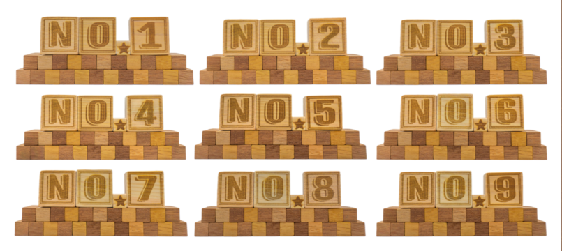 モザイク柄のウッドキューブの台にのった1から9までの番号のリスト表示の素材