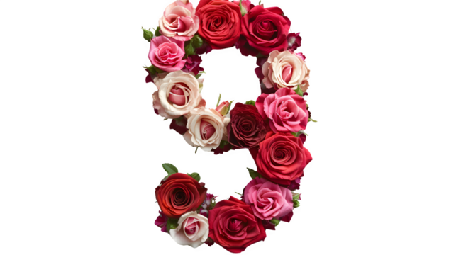 Digit 9 made with roses, PNG file, transparent background, isolated on white