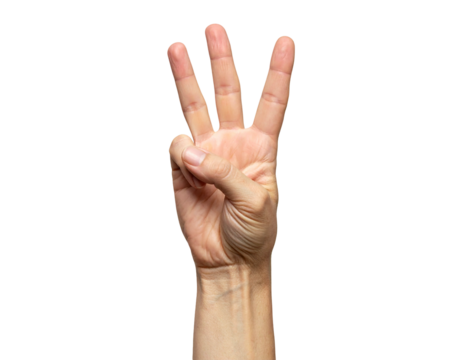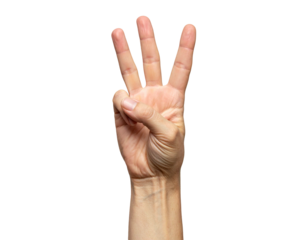 Hand showing three fingers raised against a white background.