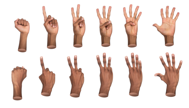 A set of hands shows numbers from zero to five using front and back views. Each gesture is clearly
