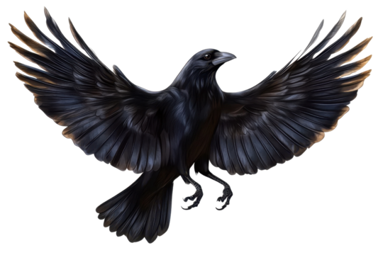 High-resolution image of a crow with wings slightly spread- isolated on a transparent background- perfect for graphic design and artistic projects.
