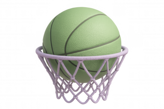 Pastel green basketball swooping toward purple hoop, digital rendering against transparent background