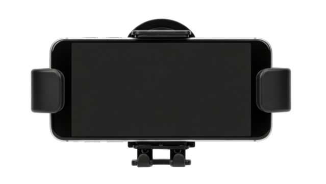 Modern black smartphone held securely in a universal car air vent mount phone holder, ideal for displaying navigation applications, handsfree calling, and safe driving.