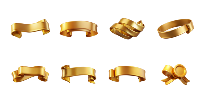 Collection of various realistic 3d shiny gold ribbon banners and scroll shapes for award design on transparent background