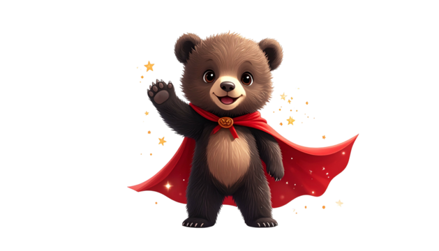 Adorable cartoon bear in a red cape, waving, with a smiling face and gold stars