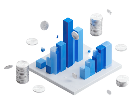 Isometric illustration features a digital design with blue bars and silver coin elements