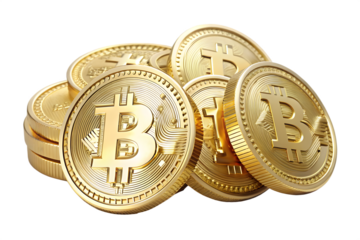 A closeup, isolated on transparent background, view of a pile of shiny golden bitcoin coins, symbolizing digital currency, investment, and financial technology