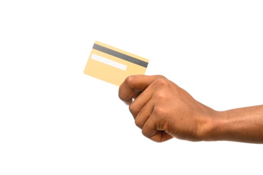 Hand holding blank credit card with gold chip, mockup for finance, banking, or payment design. Contactless transaction, shopping, and electronic payment concept. Isolated on white background..
