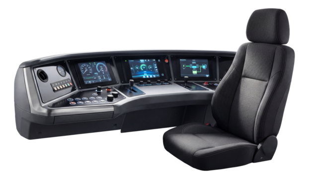 Electric train driver's cabin with a digital dashboard and comfortable seating.