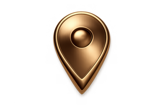 Bronze metallic map pin icon showing global location, gps tracking, and navigation point, transparent background