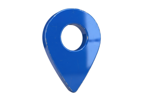 extreme close-up of a dominant, ultra-glossy electric blue gps location pin icon showing fine distress, isolated on a transparent background. concept of persistent digital navigation and wear over
