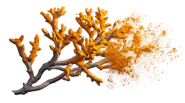 Tree creature disintegrating while running, fantasy character dissolving into digital particles on transparent background